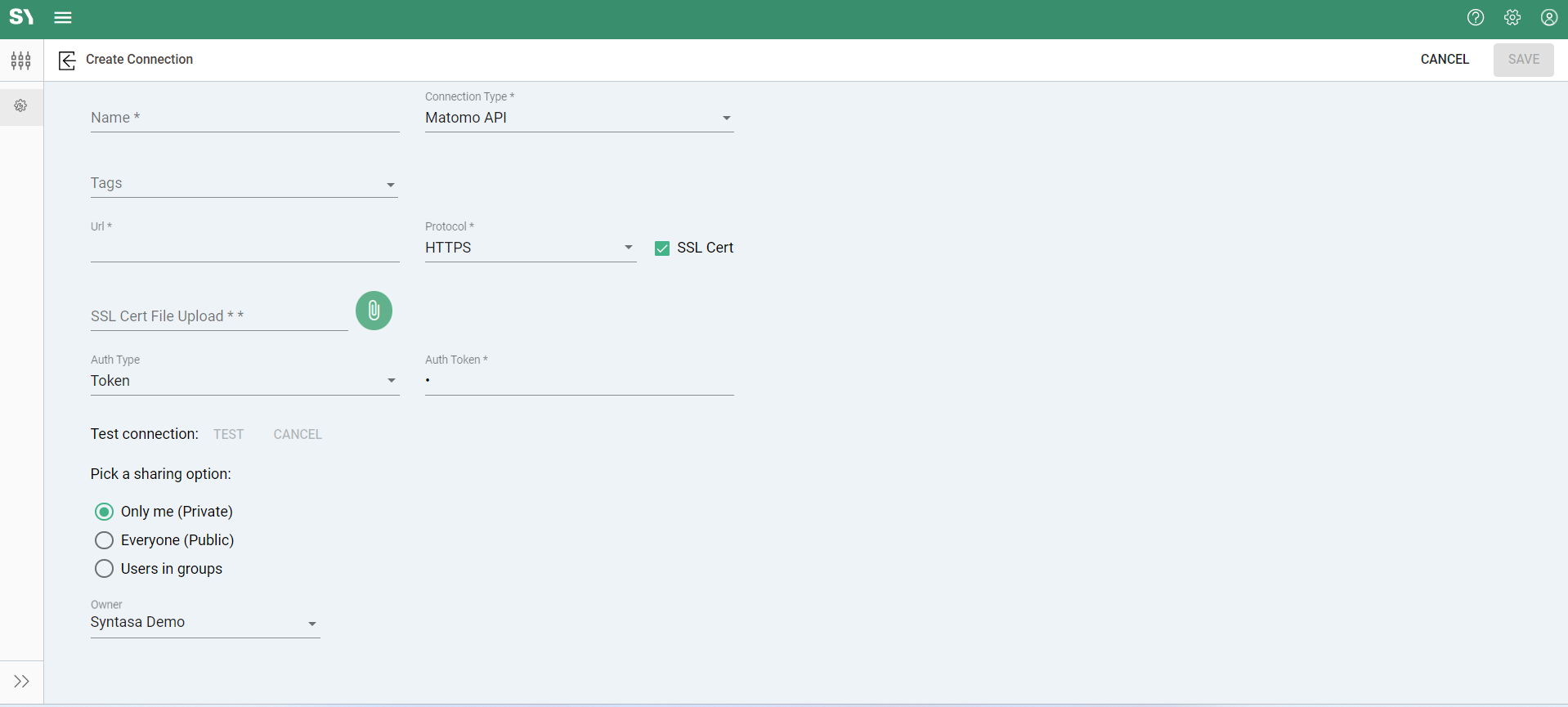 - Protocol (HTTP or HTTPS): Specifies the communication protocol used to access the Matomo server, either HTTP or HTTPS. When you select 'HTTPS', you will be provided the option to upload SSL certificate by selecting 'SSL Cert' checkbox.
