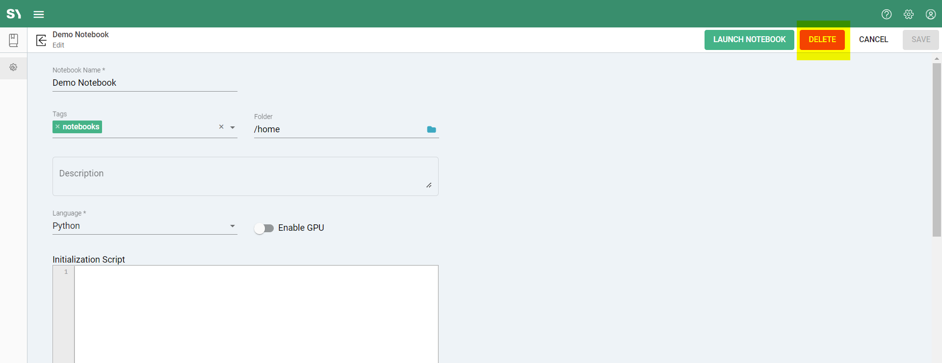 You can find the 'Delete' option on the 'Edit Notebook' page (as highlighted below).