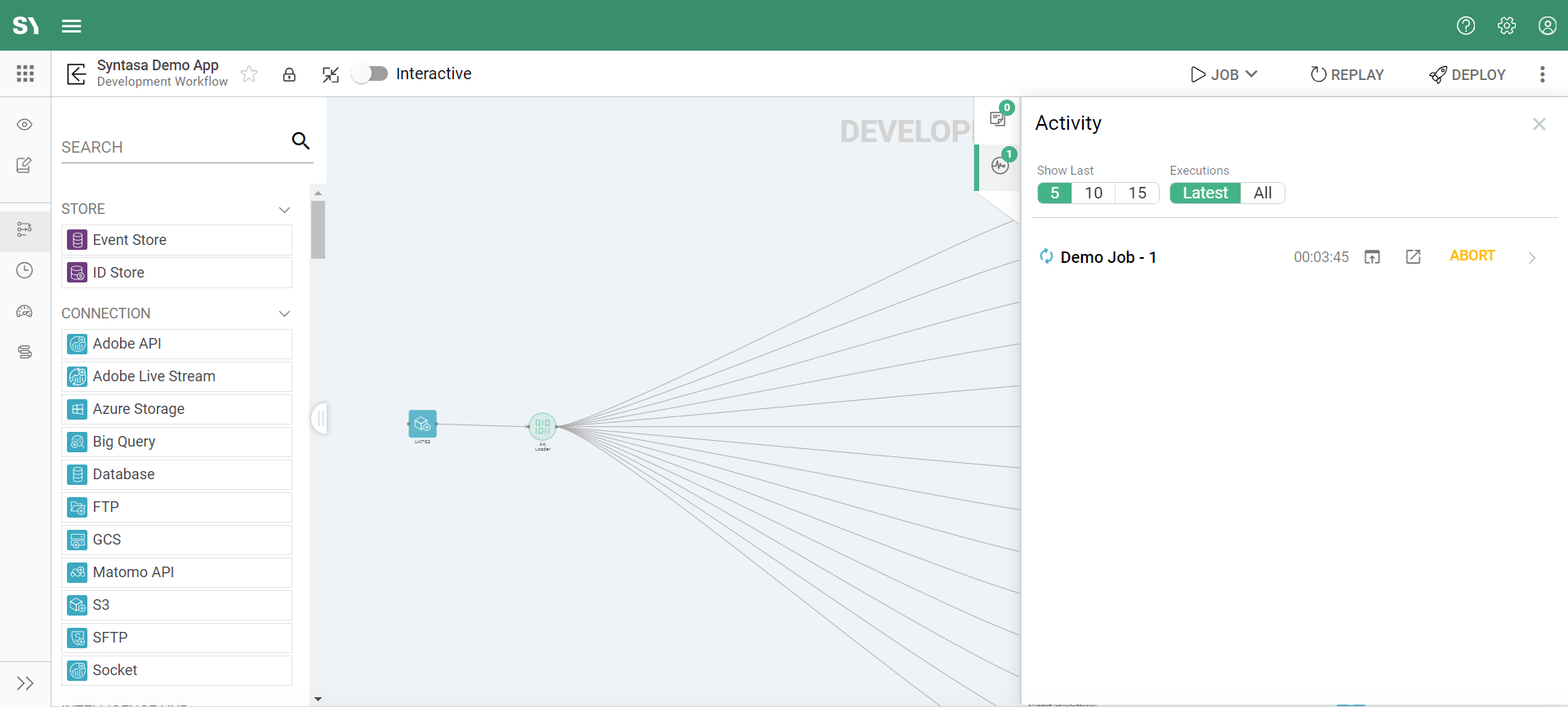- Click the 'Activity' icon shown on the left sidebar. Upon clicking 'Execute', you will see an 'Activity' screen as shown below. This screen shows the list of jobs that were executed or being executed. In the below example, it shows the job that we just triggered. As it is our first job, it is suffixed by '-1' and for the next job, it will be suffixed by '-2'.