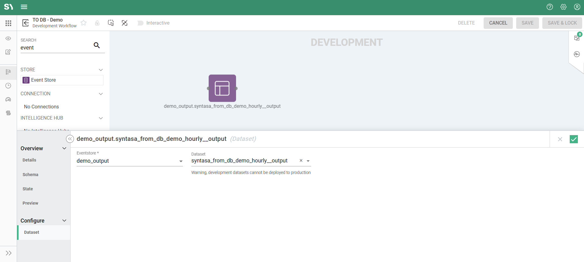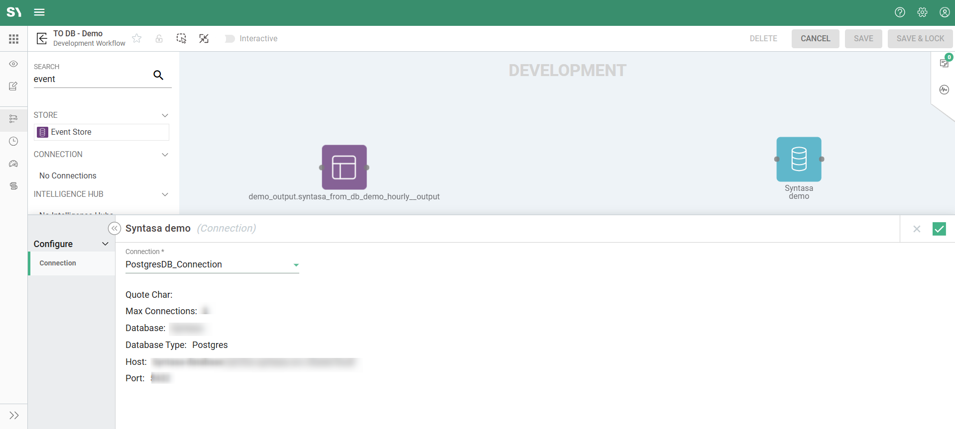 - Set up the workflow using Event Store, TO DB, and a Database Connection