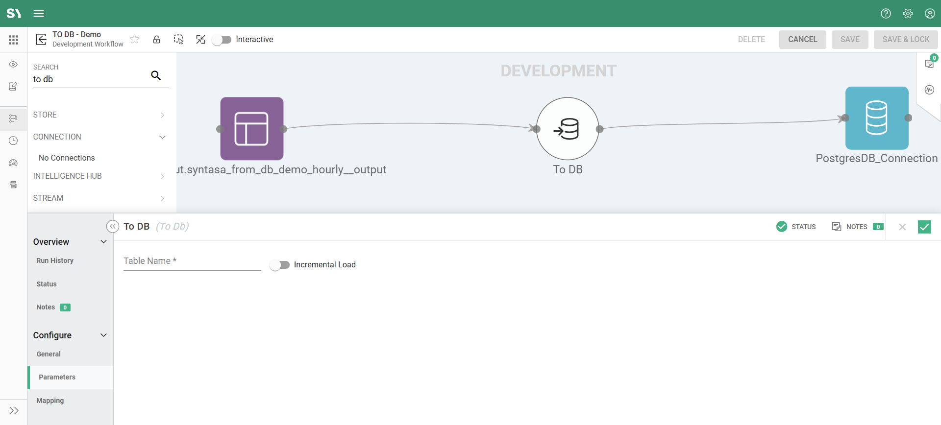 - Click on the TO DB node on the workflow canvas. This will open the configuration panel, where you can specify various settings.