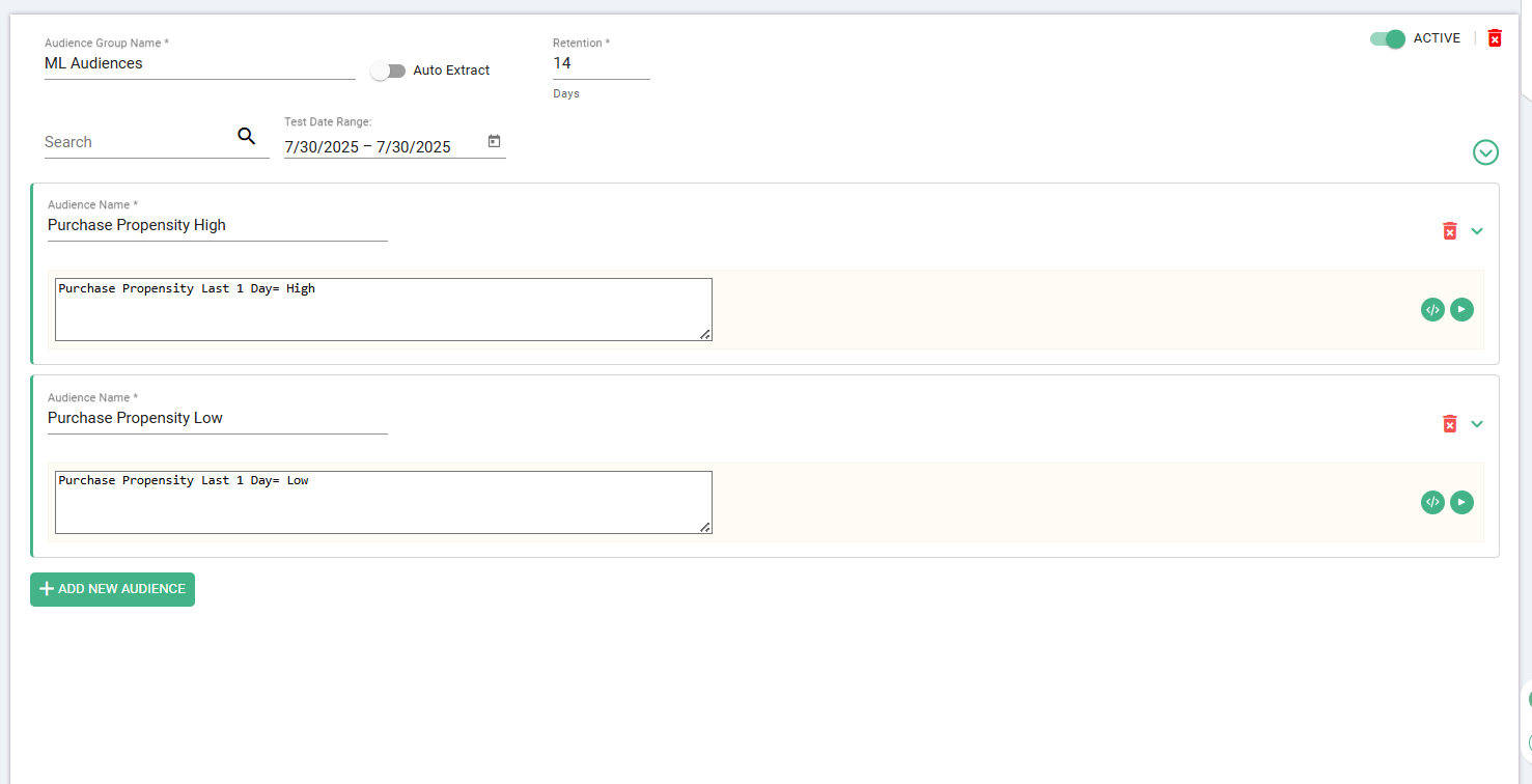 In the sample below, a purchase propensity machine learning model was built where the data scientist provided the users with a table of raw scores ranging from 0 to 1, and attributes were built to set thresholds to define 'high propensity to purchase' and 'low propensity to purchase'. These attributes are being to derive audiences with retention set at 14 days.
