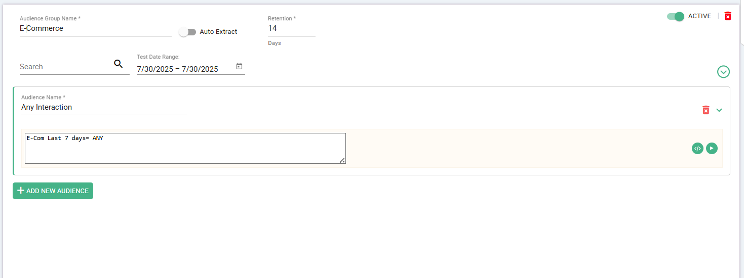 In this example, we've built several e-commerce-related attributes, and we want to build an audience that had any type of e-commerce-related action yesterday. The keyword ANY in the right value allows the app to locate any IDs where there is an 'E Comm Last 7 Days' attribute.