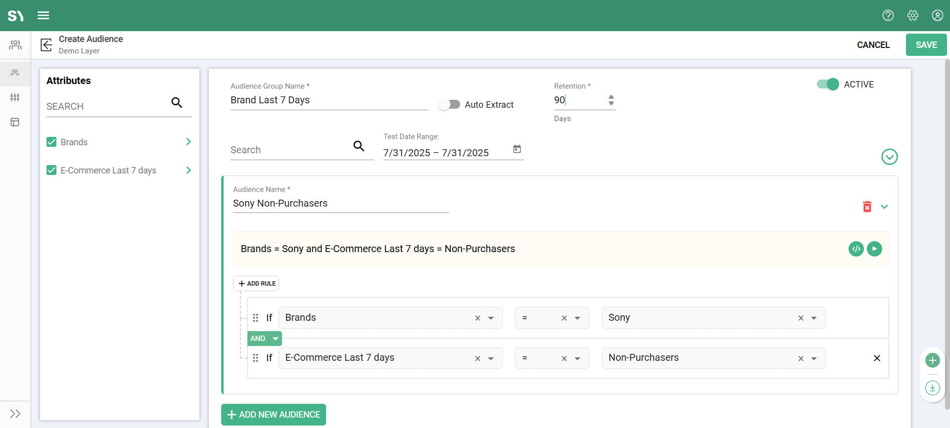 An Audience group named Brand Last 7 Days has been created, featuring an audience value called Sony Non-Purchasers. The group uses a logical AND condition to combine attributes, effectively capturing the following logic: