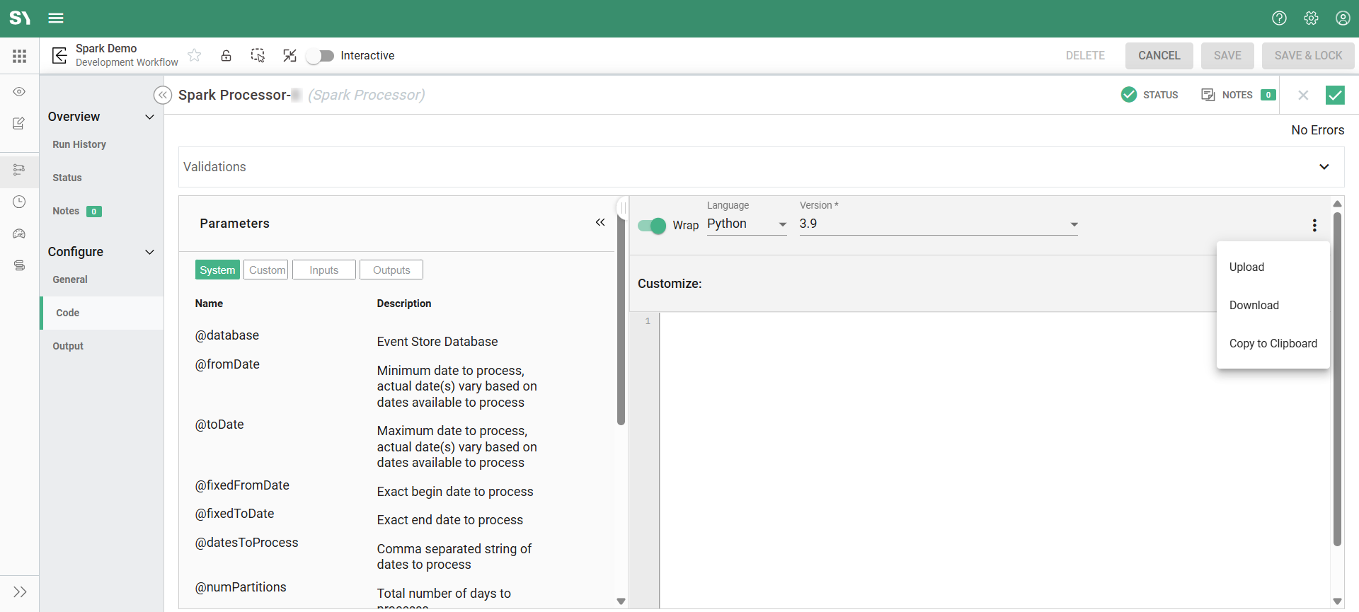 .py,.scala, or.rfile). The uploaded code replaces the existing code in the editor. - Download Code: You can download the existing code in a text file format by clicking the Download button. This is helpful for maintaining versioned backups or sharing scripts.