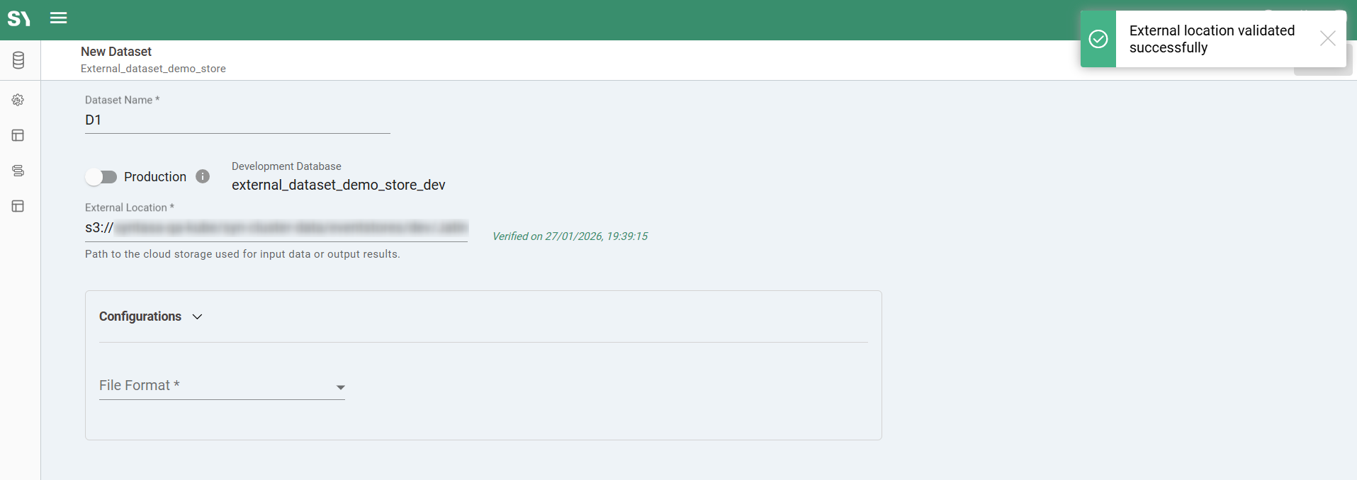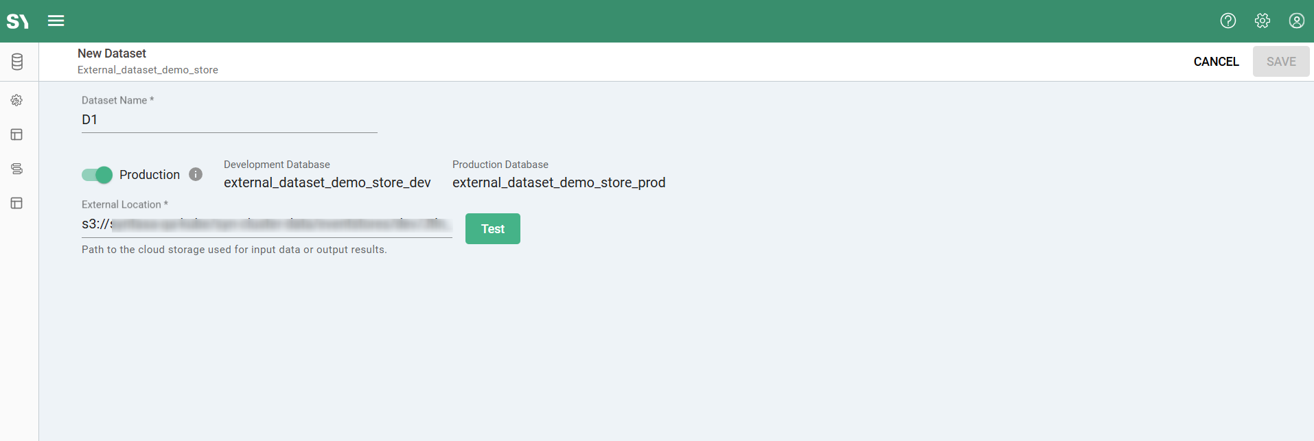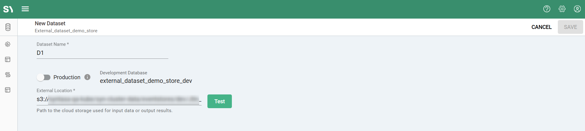When the application is deployed to the production workflow, a dataset is created in the production database that points only to the internal Syntasa location. In this case, production executions do not write to the external location.