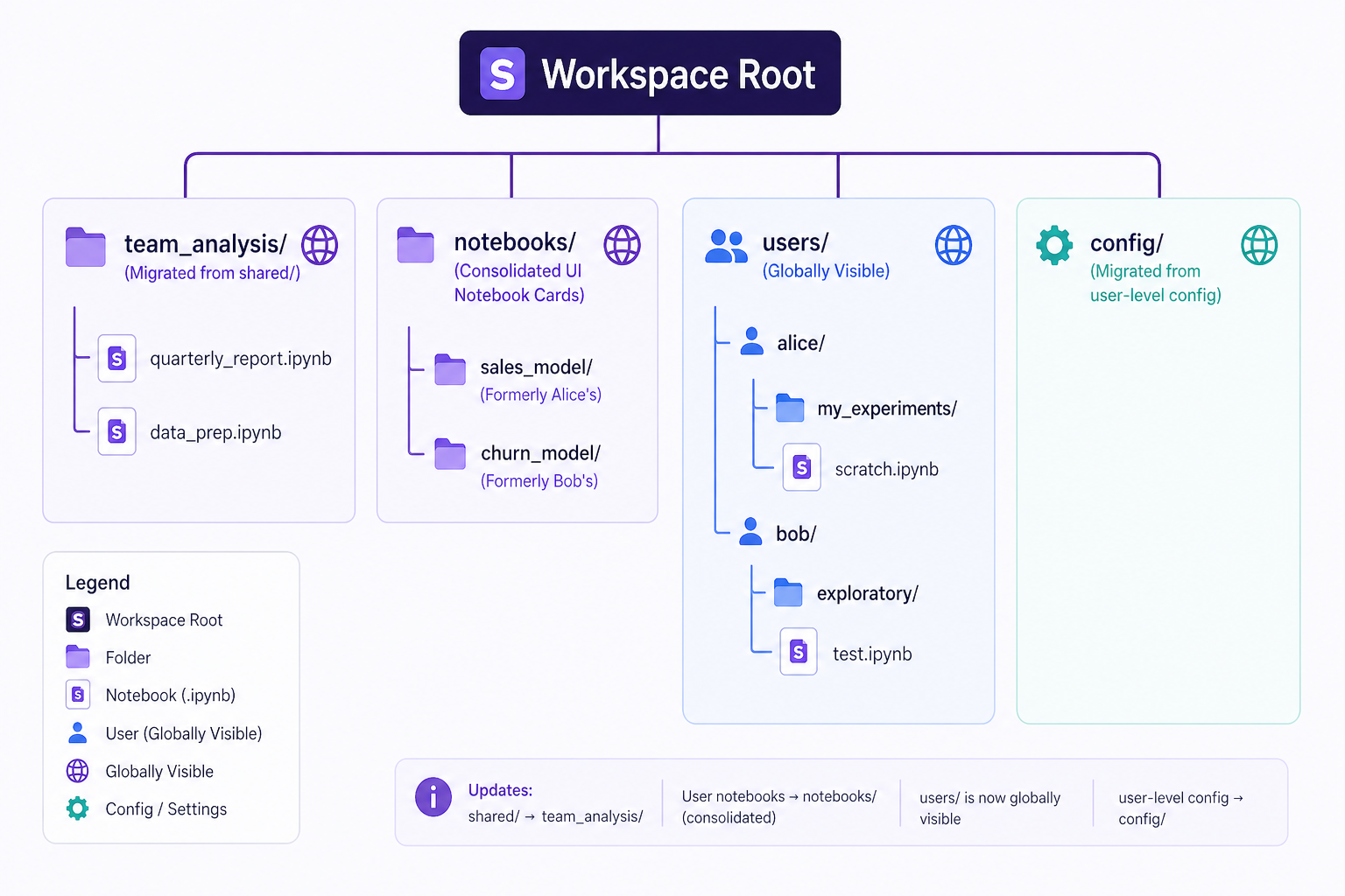 - JupyterLab notebooks under your username folder remain in users/{you}/ but are no longer private - all workspace members can now browse into any user's folder