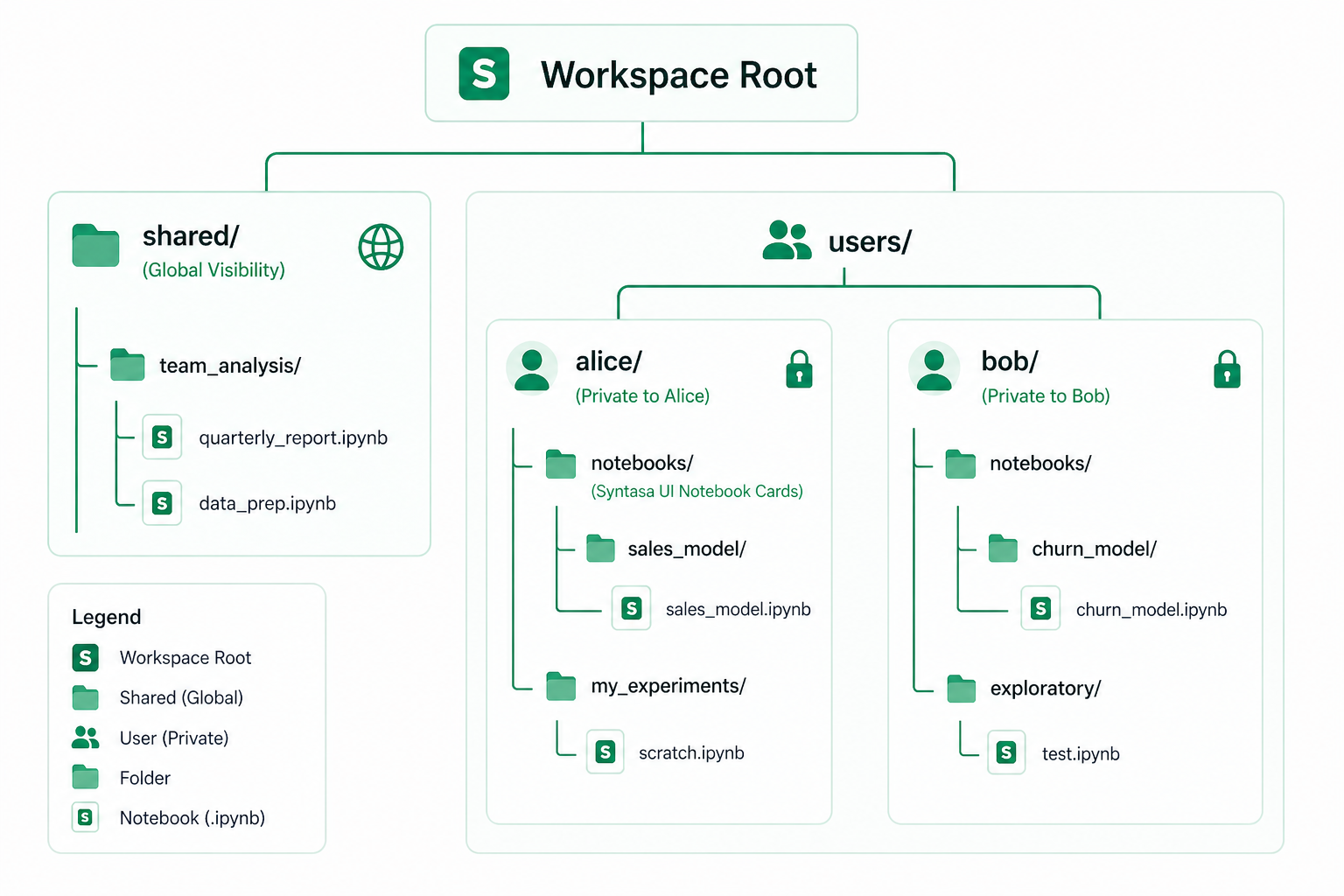- Notebook cards (created through the Syntasa UI) were stored inside each user's private notebooks/ folder. Only the creator could see them in JupyterLab.