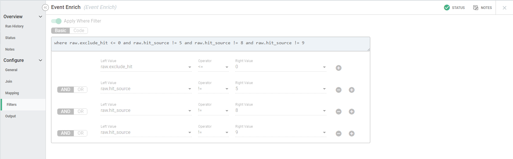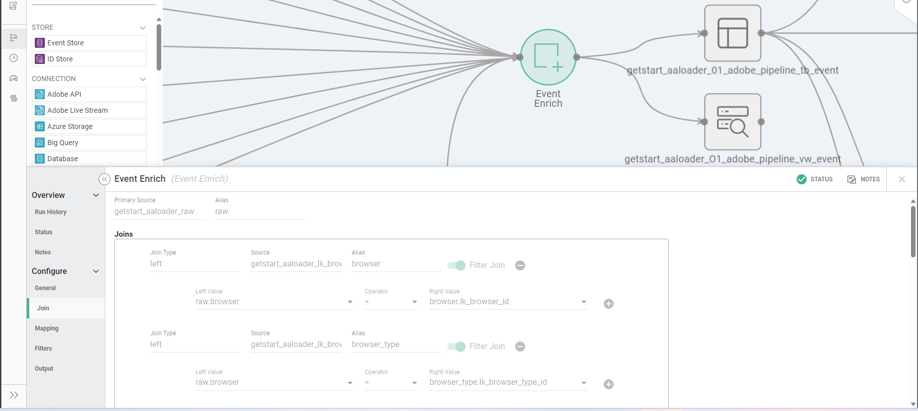 The Event Enrich process includes four screens providing the ability to join multiple datasets, map to the schema, apply desired filters, and understand where the data is being written. Below are details of each screen and descriptions of each of the fields.